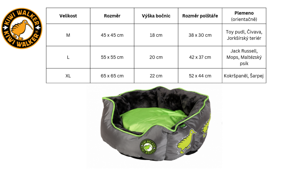 Pelíšek z ortopedické paměťové pěny. Jedná se o poddajný materiál, který se tvaruje pomocí váhy a má hypoalergenní vlastnosti. Pěna se vytvaruje podle tvaru těla vašeho mazlíčka, a tím sníží tlak na jeho klouby. Zároveň pomáhá zachovávat páteř v přirozeném tvaru. Pelíšky jsou také díky technologii Kiwi Easy-Clean System snadno rozložitelné na více částí, díky tomu se potahy dají krásně vyprat a vyčistit. S Kiwi Walker je i boj s nečistotami, skvrnami a pachy jednoduchý.
